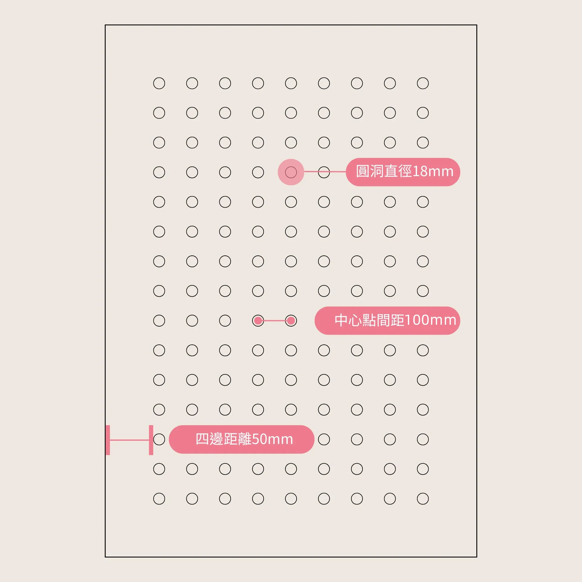 洞洞板的孔徑通常分為 5mm、8mm 和 12mm,孔與孔之間的間距則為 25mm、30mm 和 75mm。不同廠商可能提供其他規格。