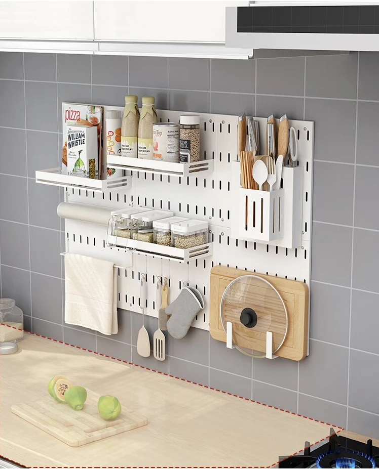廚房洞洞板可以有效地提升廚房的整潔度和效率。因為動線的考量,廚房通常不適合擺放收納櫃,因此在流理台的牆面安裝洞洞架是一種很好的選擇。