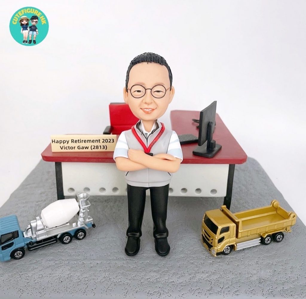 相片中的作品以人像公仔作為主角,人物戴圓框眼鏡、面帶微笑、雙手抱胸站立,呈現自信又親切的專業形象;背後配搭辦公桌、電腦與椅子,並加入專屬名牌寫上 「Happy Retirement 2023」 及姓名,清楚點出榮休主題。前方再用工程車模型作場景點綴,把多年工作領域與成就濃縮成一個細緻的桌上紀念。這類退休人像公仔不只是一份禮物,更是把一段職涯與同事間的祝福長久保存,放在家中或辦公室都份量十足、極具紀念價值。