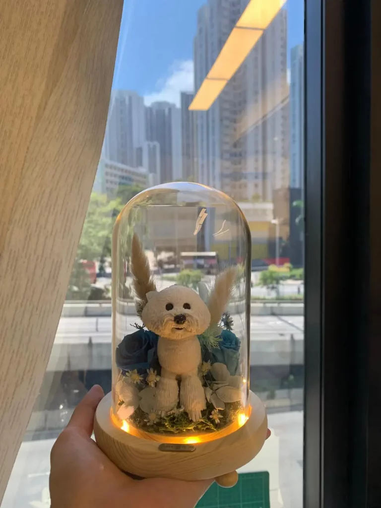 紀念永生花罩是近幾年最常見的寵物紀念方式。客製化寵物永生花罩紀念公仔,以最溫柔的方式,將您摯愛毛孩的神情與陪伴永恆定格,同時亦可以刻上寵物的名字、生卒日期或特別的紀念語,增加個人化元素。