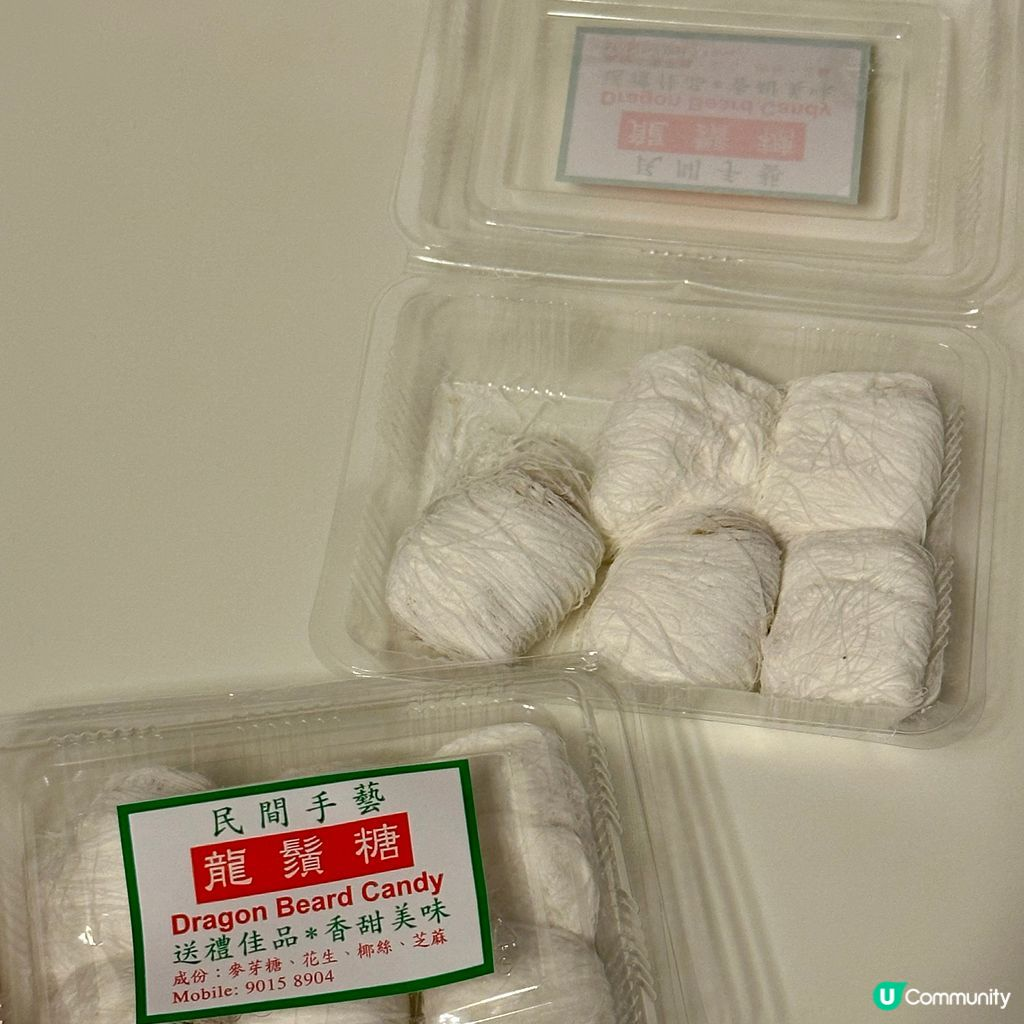 龍鬚糖是源遠流長的民間小食,糖絲細如龍鬚,因而得名。它的製作是一門精湛的技藝,需要先煮軟麥芽糖,再反覆揉搓麥芽糖成糖膠,將糖膠糰中央的洞拉大,扭成8字狀,不斷重複,直至糖膠糰呈拉絲狀。最後把餡料加入糖絲卷起,整形切成小份。