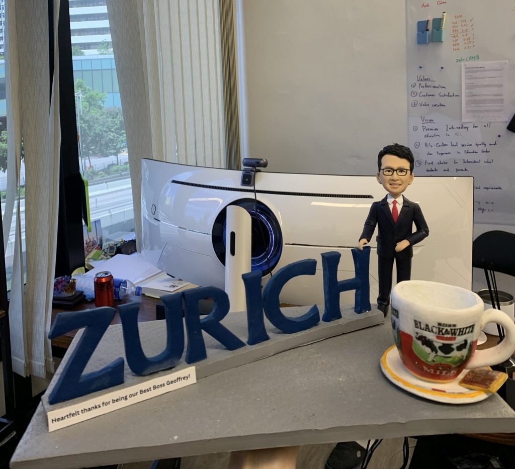 一位女性手持與自身穿搭相似的人像公仔,背景在室內。公仔為長髮造型,穿米色外套、藍色上衣與深色長褲,站在白色圓形底座上;底座前方有小金屬牌,刻有「ELKA NIP」與「THE BEST BRANCH MANAGER」等英文字樣。持公仔者穿米色外套與藍灰色絲巾,對鏡頭微笑。