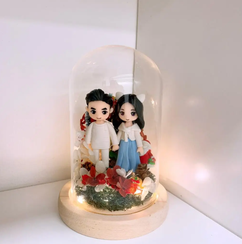 永生花藝設計: 在晶瑩剔透的玻璃燈罩內,圍繞著人像公仔的,是經過特殊工藝處理的永生花(Preserved Flower)。它保留了鮮花的柔美質感,卻能存放數年不凋謝,象徵著永恆不變的愛與情感。