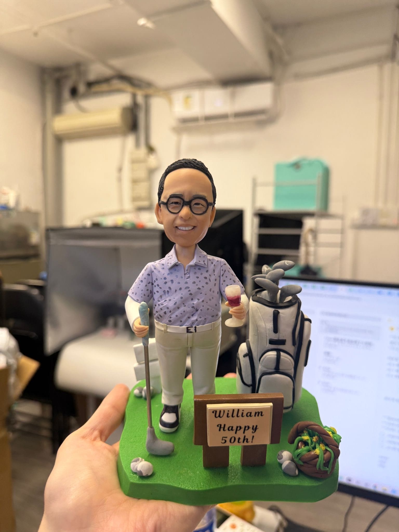 手掌托著一座高爾夫主題的人像公仔模型:人物短髮戴黑色圓框眼鏡,穿淺紫圖案襯衫與米色長褲、黑白球鞋,右手持酒杯、左手握高爾夫球桿,面帶微笑站在綠色草地台座上。人物旁有一個滿載球桿的高爾夫球包,地面散落幾顆高爾夫球與小石頭;前方立有木牌,上寫「William Happy 50th!」。台座一角有棕色藤圈與綠色裝飾。背景為室內工作環境,含電腦螢幕、空調與置物架等。