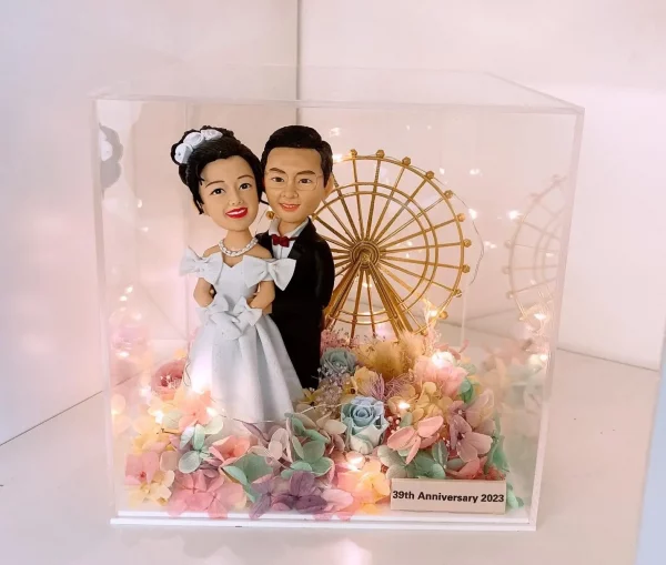 傳說摩天輪象徵著幸福,摩天輪沒有起點和終點,亦代表幸福的愛情不會終結。如想送一份充滿象徵意義且獨一無二的禮物,可以用上真人合照,製作出摩天輪下的真人周年公仔禮物,再加上永生花,代表了不會終結的幸福。