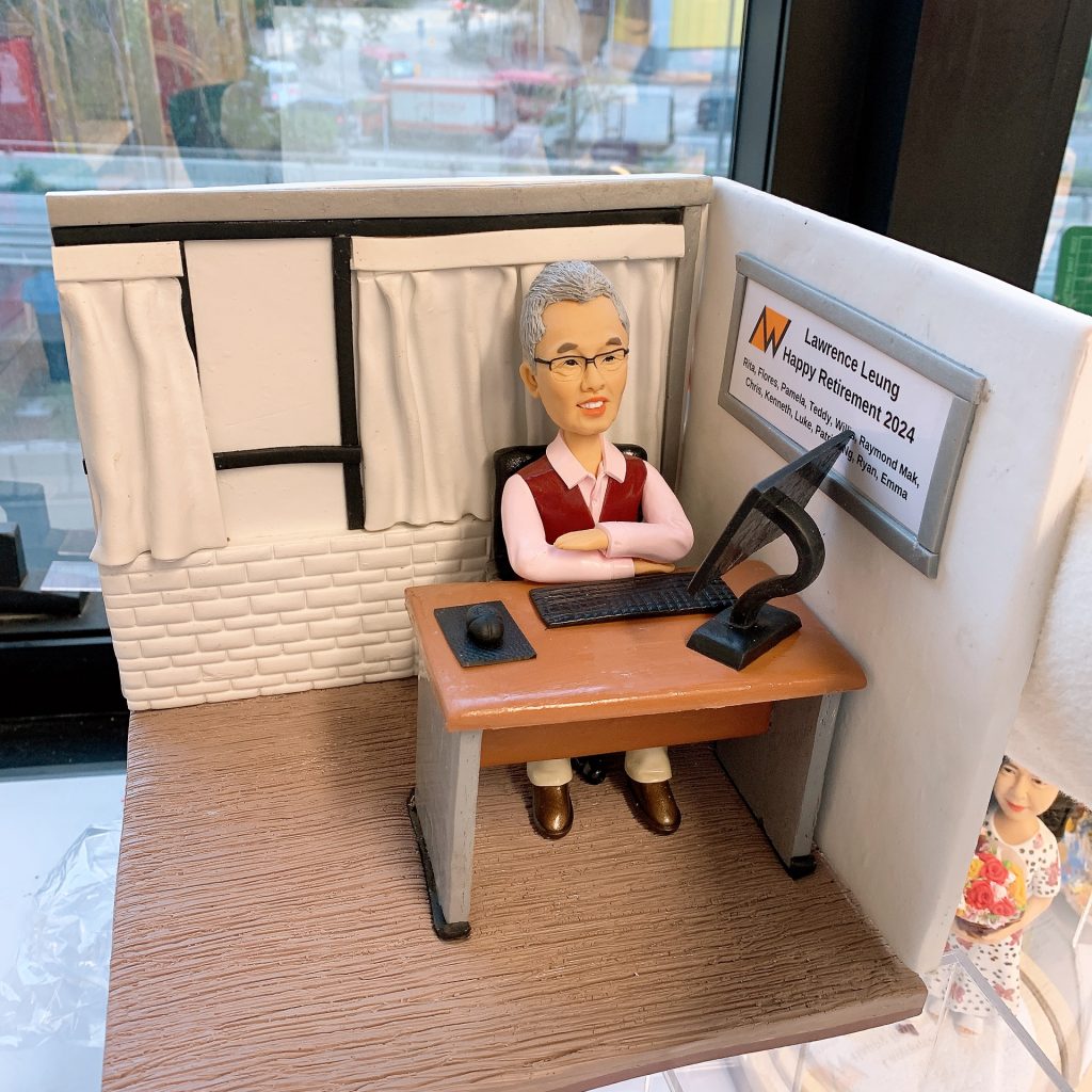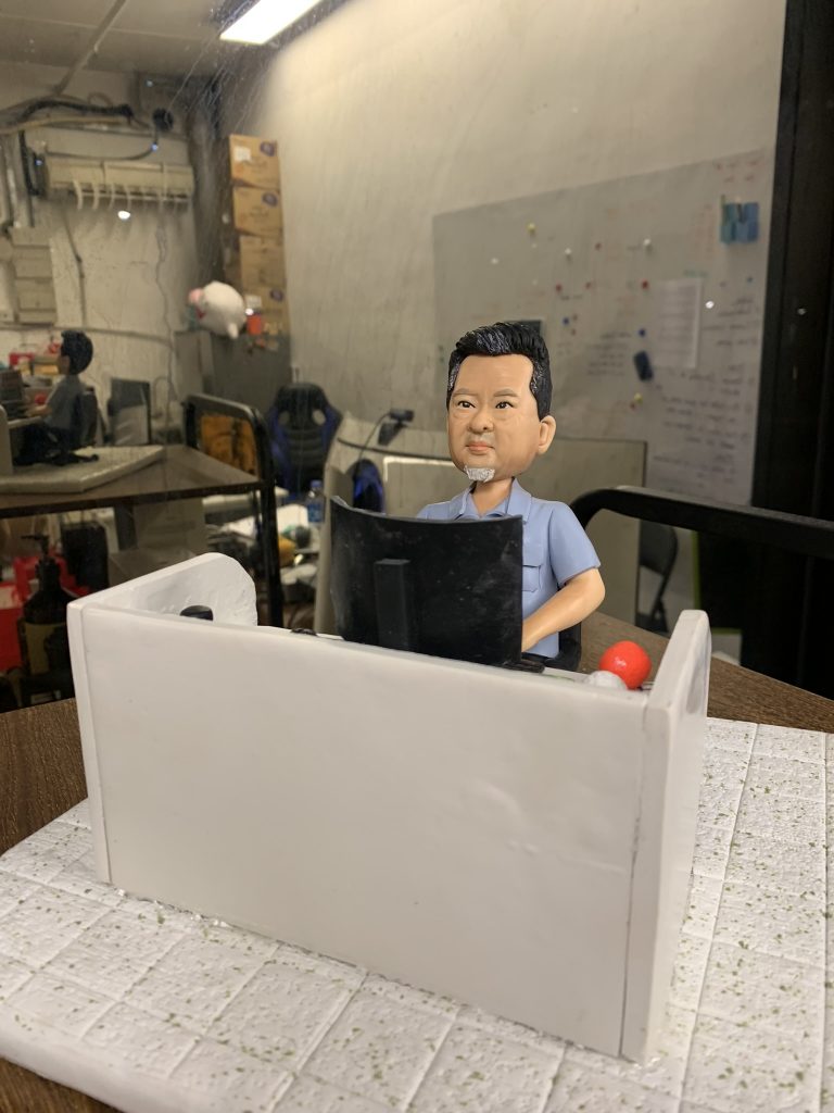 這張照片中的人像公仔,完美展現了工程師日常工作的模樣。公仔坐在辦公桌後,專注地盯著螢幕,身穿簡約的襯衫,神情認真且投入。桌上擺放著電腦螢幕和一些日常小物,還原了工程師在辦公室裡專注解決問題、處理專案的真實情景。