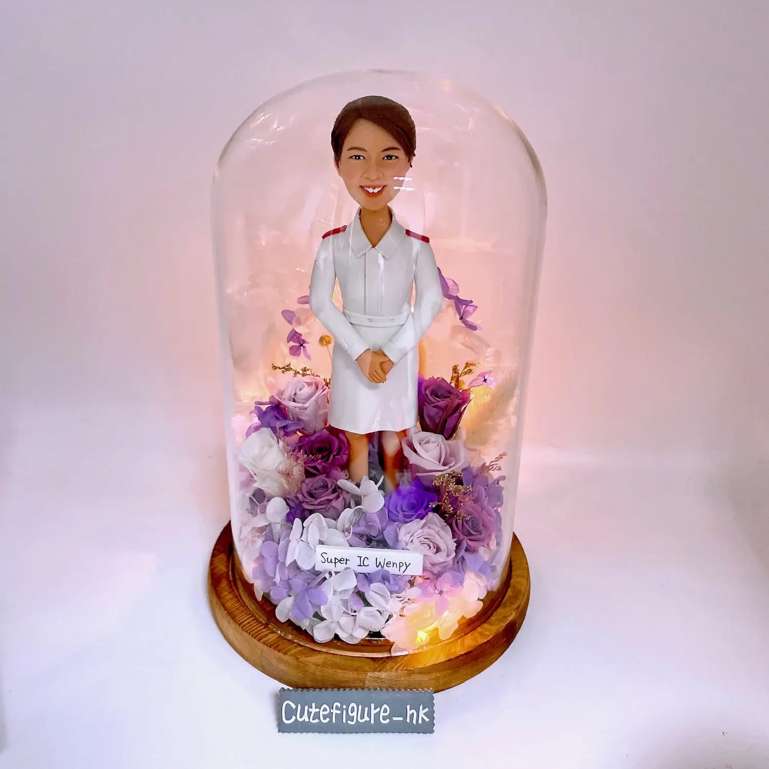 這款精緻的人像公仔是專為榮休禮物設計,呈現穿著白色制服的角色,象徵敬意與祝福。公仔周圍點綴著紫色與白色的花卉,透明玻璃罩與木底座相結合,提升了禮物的典雅與珍藏價值。