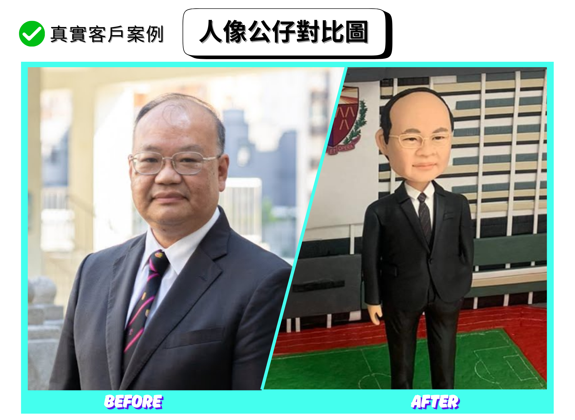 分割式「人像公仔對比圖」。左側(BEFORE):一位身穿深色西裝與條紋領帶的男性校長於戶外走廊取景,配戴眼鏡,表情沉穩。右側(AFTER):對應的人像公仔置於迷你運動場草地與紅色跑道場景前,穿黑色西裝與領帶、雙手插袋、五官與髮際細節呼應真人造型,背景可見校園建築立面與徽章的一角,呈現作為退休禮物的展示效果。