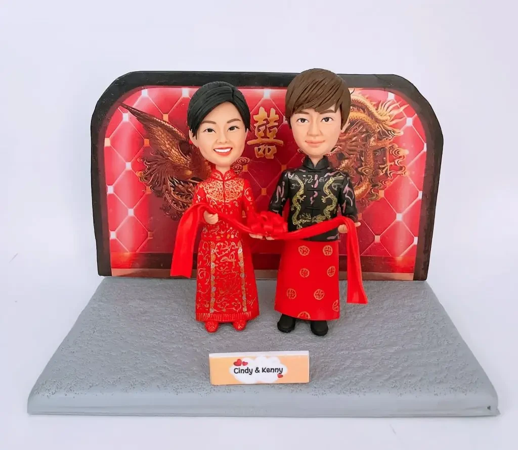CUTE FIGURE can present your love story in a concrete art form. The doll is based on the prototype of the newlyweds, and its appearance features are carefully restored. It is dressed in traditional Chinese wedding costumes, symbolizing a happy and fulfilling marriage.