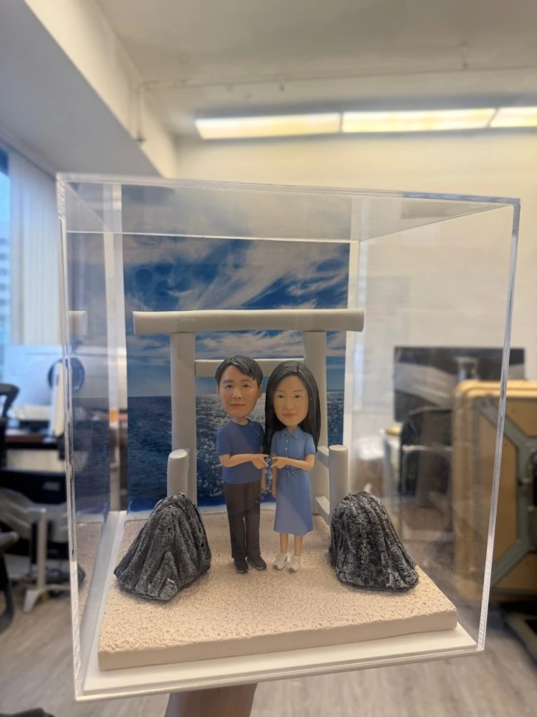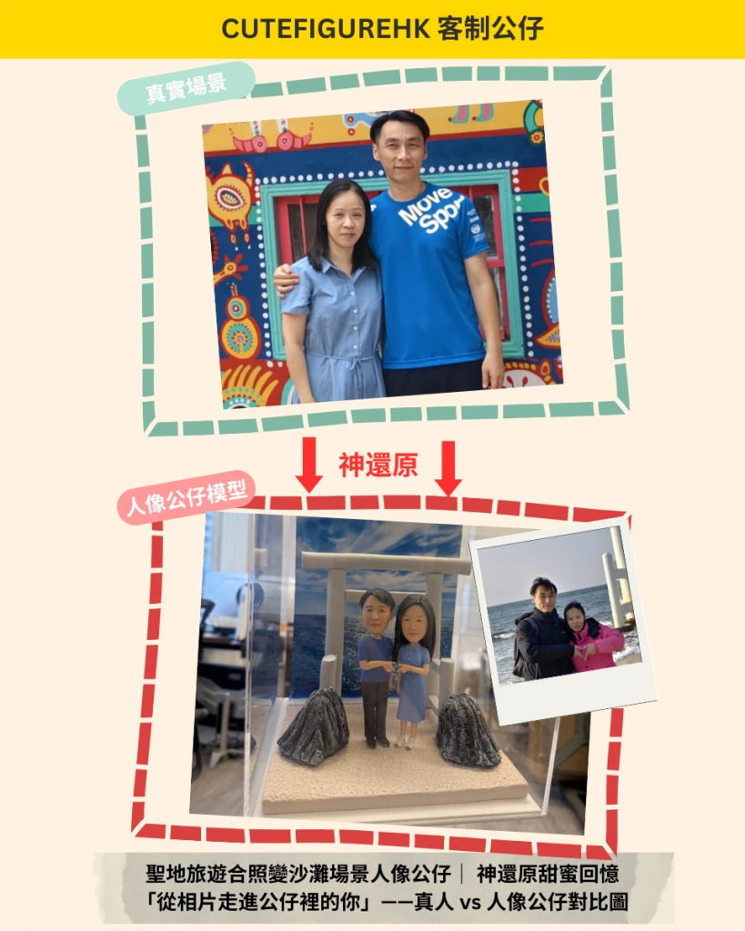 情感氛圍的還原與昇華: 這是更深層次的一層。廣告文案寫著「聖地旅遊合照變沙灘場景人像公仔」。這揭示了一個關鍵的創作過程:場景的置換與理想化。製作者並沒有照單全收地複製原始照片中色彩斑斕但可能略顯雜亂的背景,而是選擇了一個更具象徵意義的場景——擁有日式鳥居的寧靜沙灘。