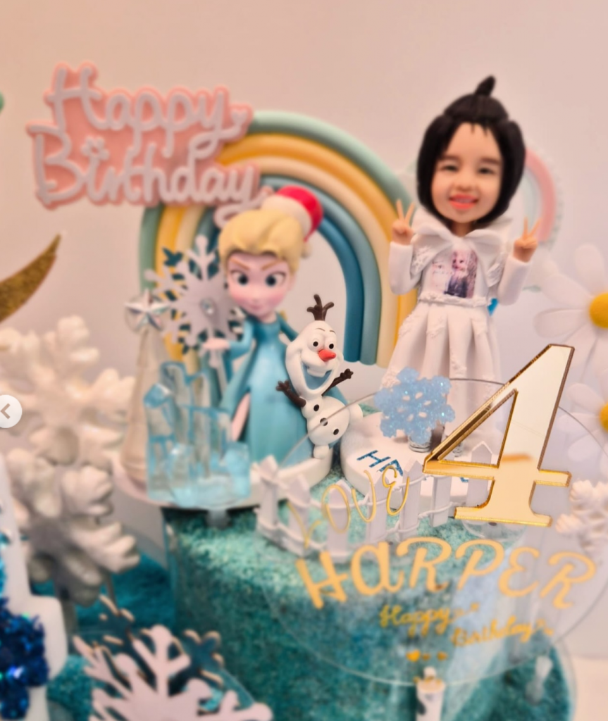 - 物理上的制高點: 在這個精緻的冰雪場景中,迪士尼官方的艾莎(Elsa)公仔被放置在較低一層,而代表 Harper 的客製化公仔,則站在整個冰雪城堡的最高處。這個佈局充滿象徵意義:在這個專屬於她的世界裡,Harper 的地位超越了她所崇拜的偶像。她不是艾莎的訪客,而是這個王國的中心與主人。