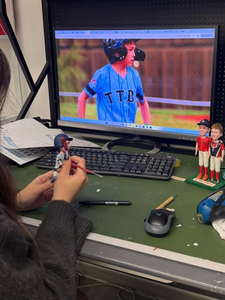 精準的復刻: 師傅一手穩穩地托住人偶素坯,另一手執起纖細的畫筆,正在為「FALLON」的34號球衣,一筆一劃地描繪背號的黑色輪廓。這個動作需要極致的穩定性與專注力。任何一絲顫抖,都可能破壞作品的完美。從字體到線條的粗細,都必須精準對應螢幕上的原始設計。