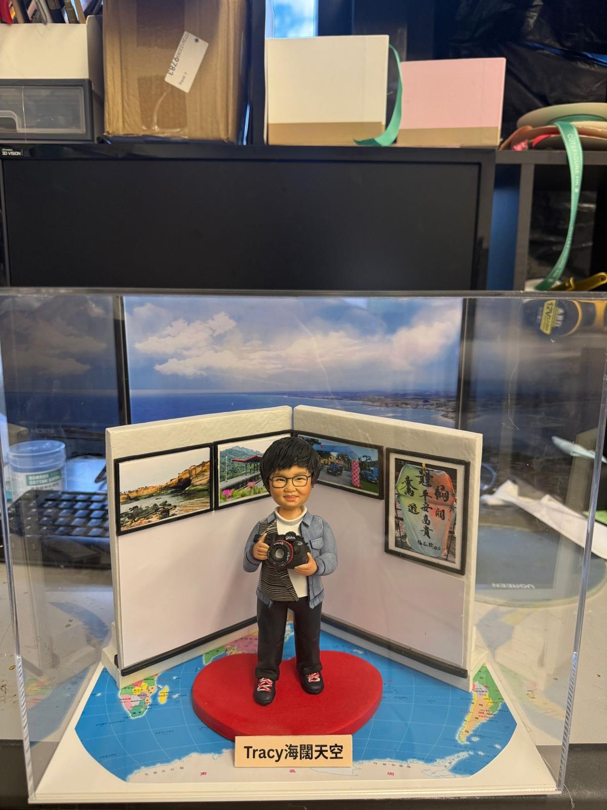透明展示盒中的攝影主題公仔:短髮戴眼鏡的人物手持相機站在紅色愛心地墊上,背後三折屏風掛有風景照與書法字畫;地台鋪世界地圖,前方銘牌寫「Tracy 海闊天空」。