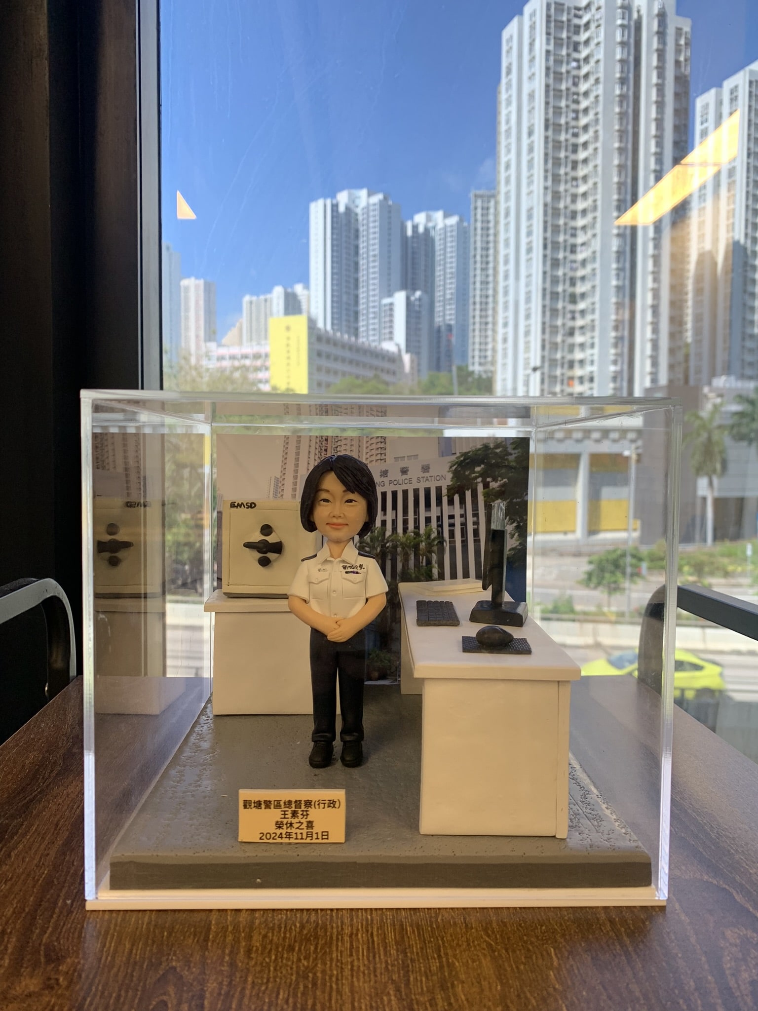 一款為香港女性總督察訂製的榮休人像公仔,場景還原了她的辦公室,並配有書桌、電腦及夾萬等背景配件裝飾。