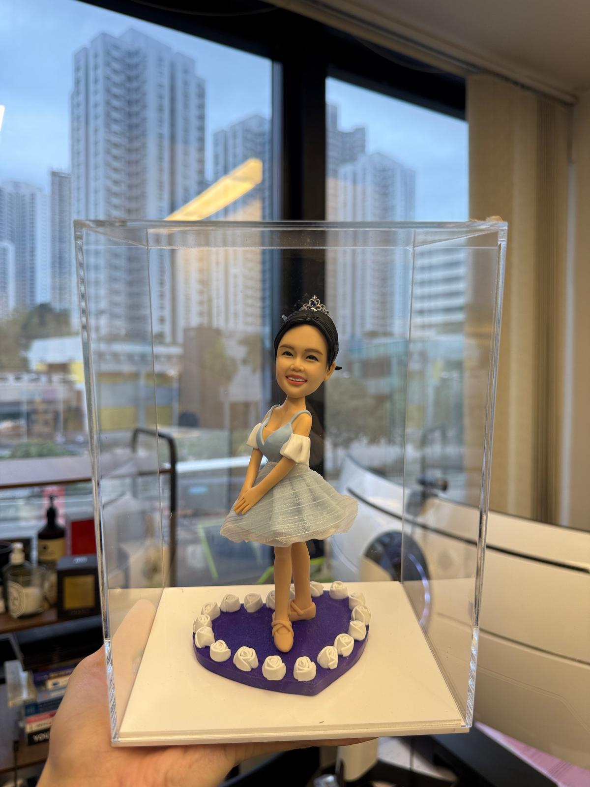 作品以芭蕾舞台為靈感:人物梳髮戴銀色小冠,著淡藍薄紗裙與芭蕾舞鞋,呈現端莊的屈膝禮姿。地台採紫色愛心設計,周圈以白色玫瑰點綴,增添浪漫儀式感;外層透明盒便於防塵展示。可客製髮飾、裙色、動作姿態、銘牌文字與底座配色,適合作為舞展紀念、生日禮或房間擺設。