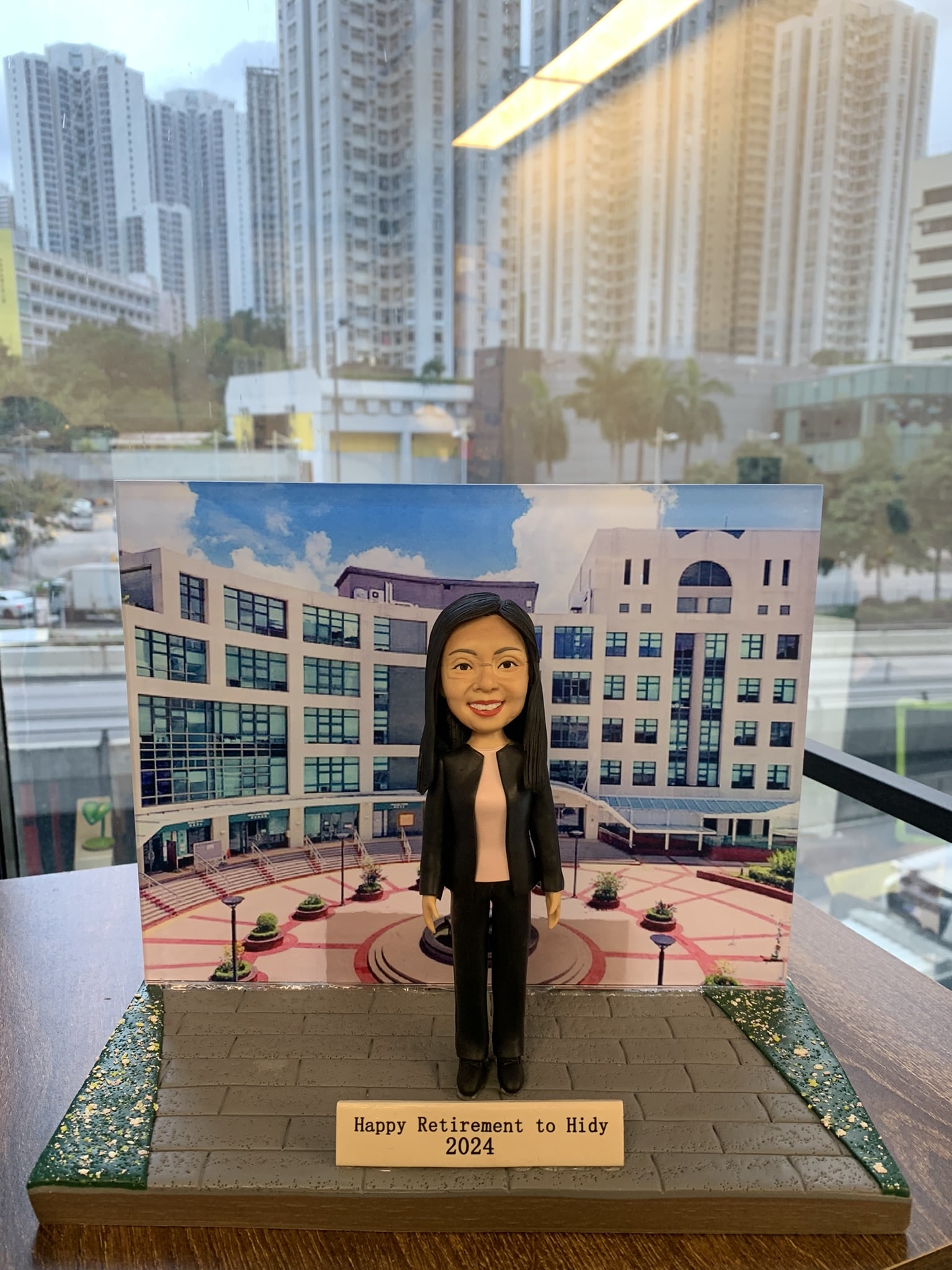 一款人像公仔作為退休公仔展示,公仔留長黑髮,穿黑色西裝外套與長褲、內搭淡粉上衣,站在灰色磚紋地台上;背景板印有白色與淺色系的多層學校/校園建築與中庭圓形花壇。底座前方牌匾寫有「Happy Retirement to Hidy 2024」。整體擺放在木紋桌面上,窗外可見高樓城市景觀。