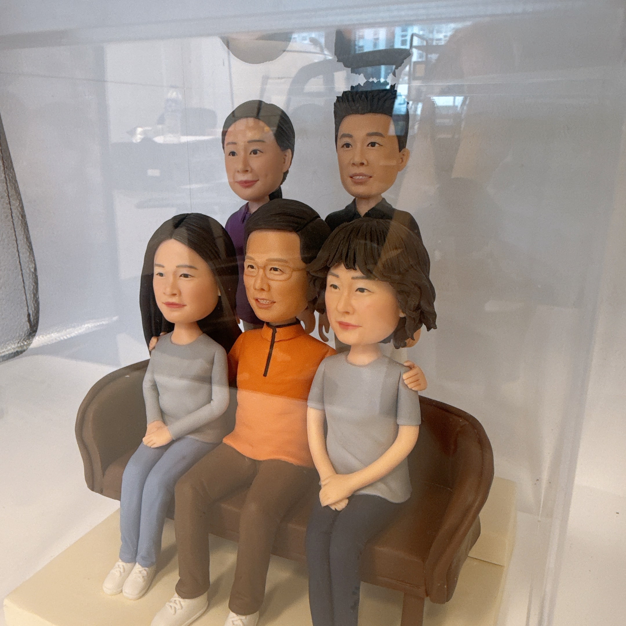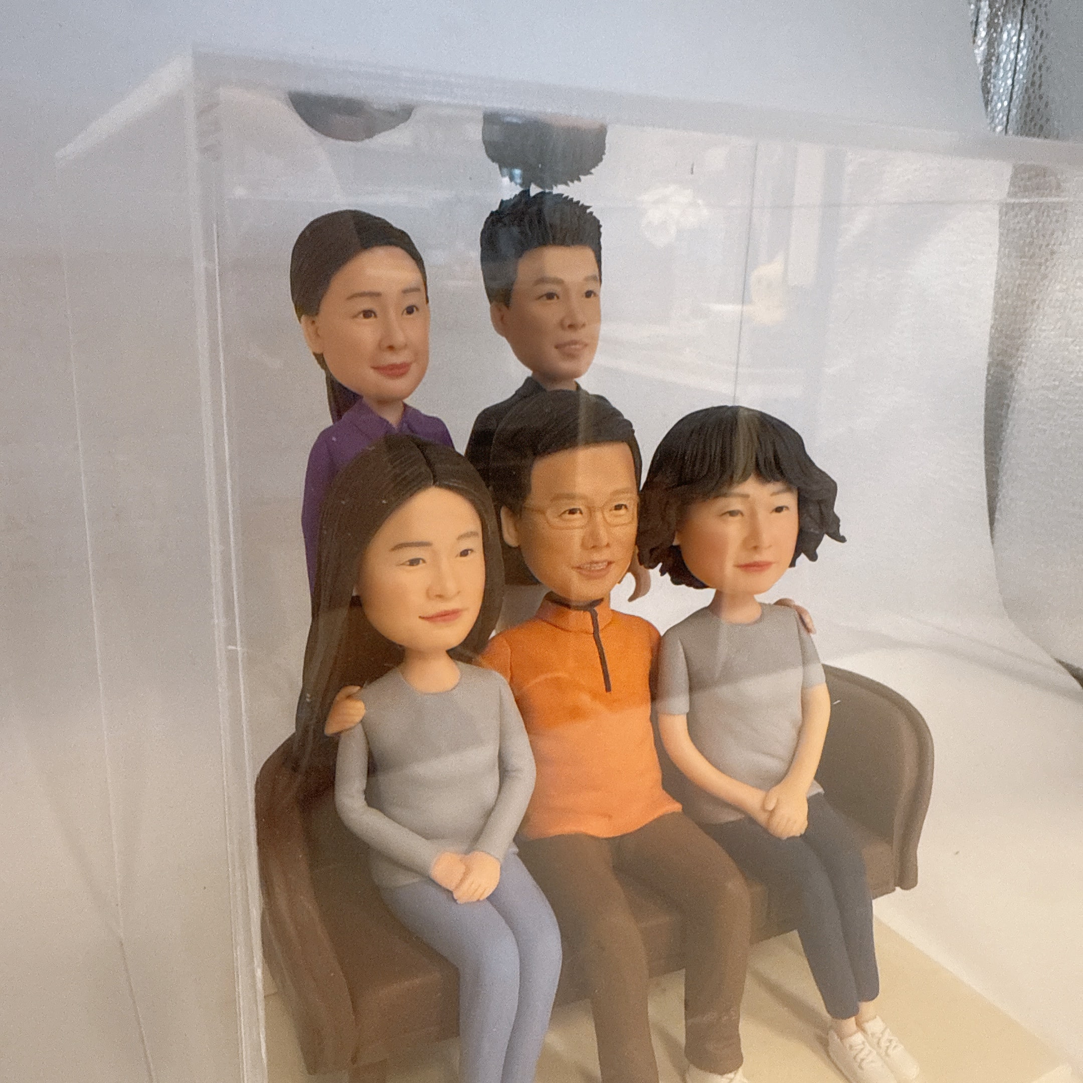 一組家庭主題的人像公仔擺設放在透明展示盒內:前排三人坐在咖啡色沙發上,左側長髮女生與右側短髮女生穿灰色上衣與運動鞋,中間男子穿橙色上衣與眼鏡;後排兩位站在後方,一位穿紫色上衣、一位穿深色上衣。底座前方有淺色小牌寫著「媽媽 生日快樂!」。背景是簡潔的室內白色環境,展示盒邊緣與反光可見。