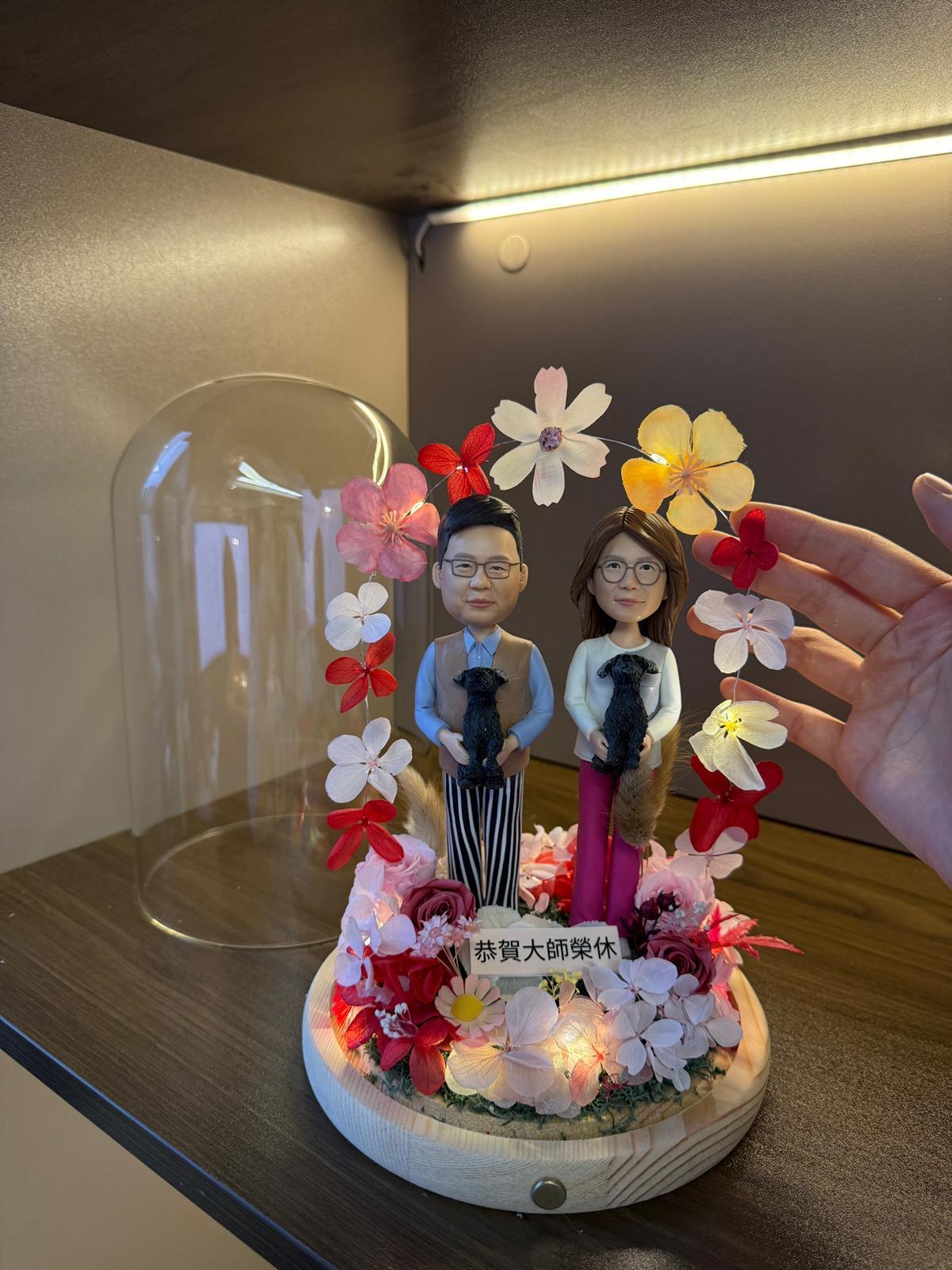 玻璃罩木底座內的客製長輩公仔場景,一對男女手抱黑色小狗,周圍佈滿粉紅與米白乾燥花並點綴暖黃燈串,前方放有「恭賀大師榮休」字牌。