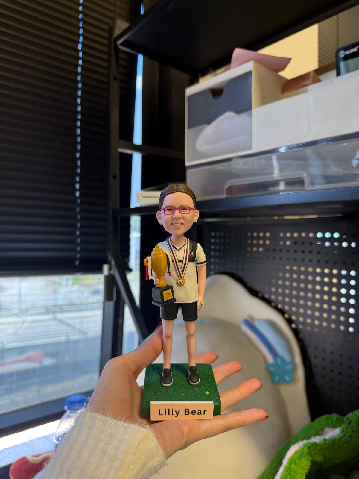 手掌托著客製學生公仔,戴粉紅框眼鏡、穿白色運動上衣與黑色短褲,胸前掛多面獎牌、手拿金色獎盃,綠色草地底座上有名牌「Lilly Bear」