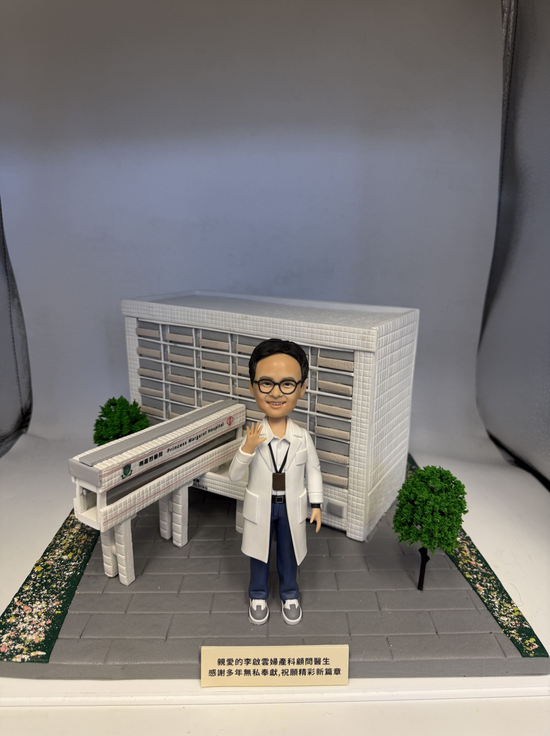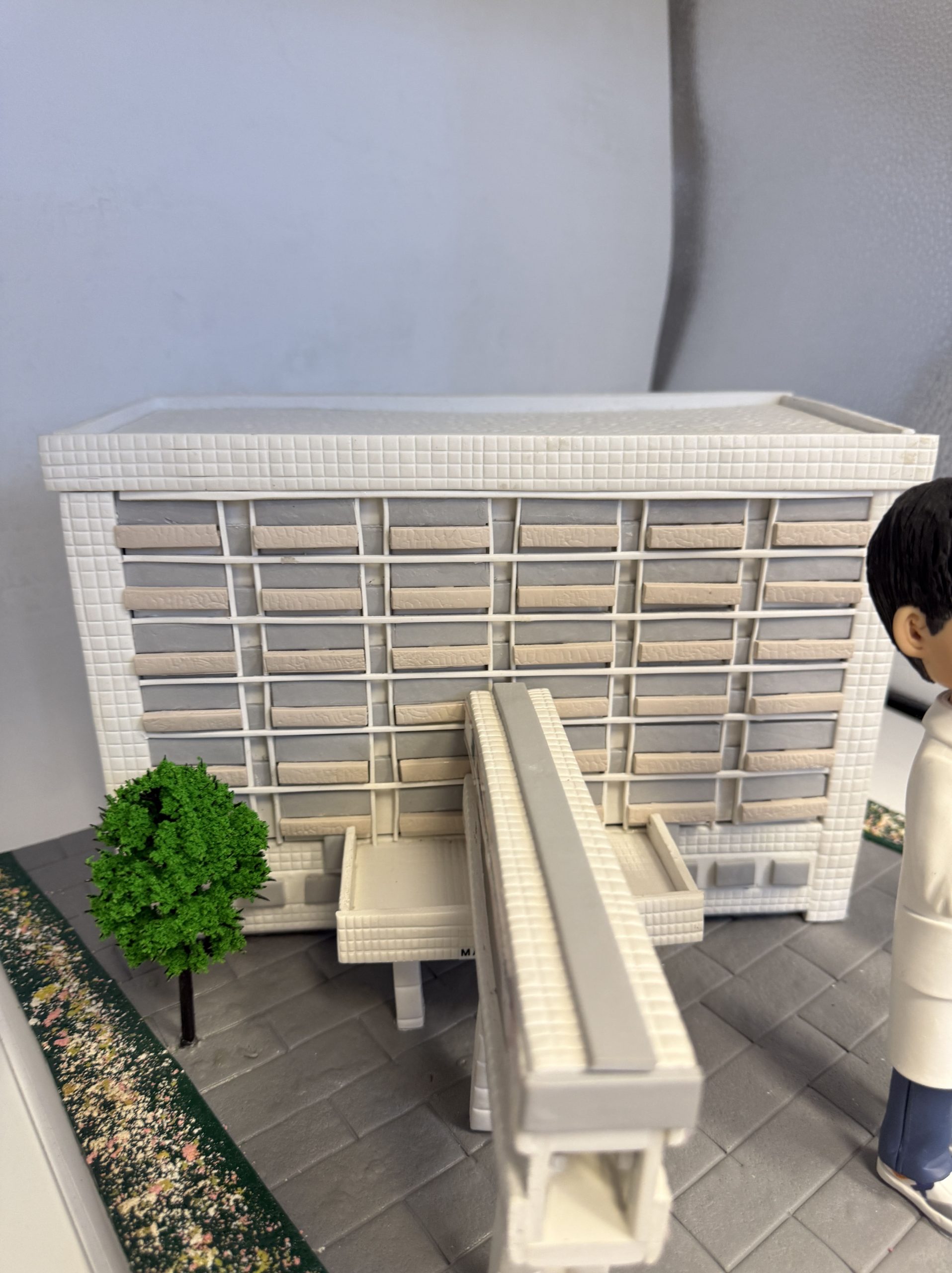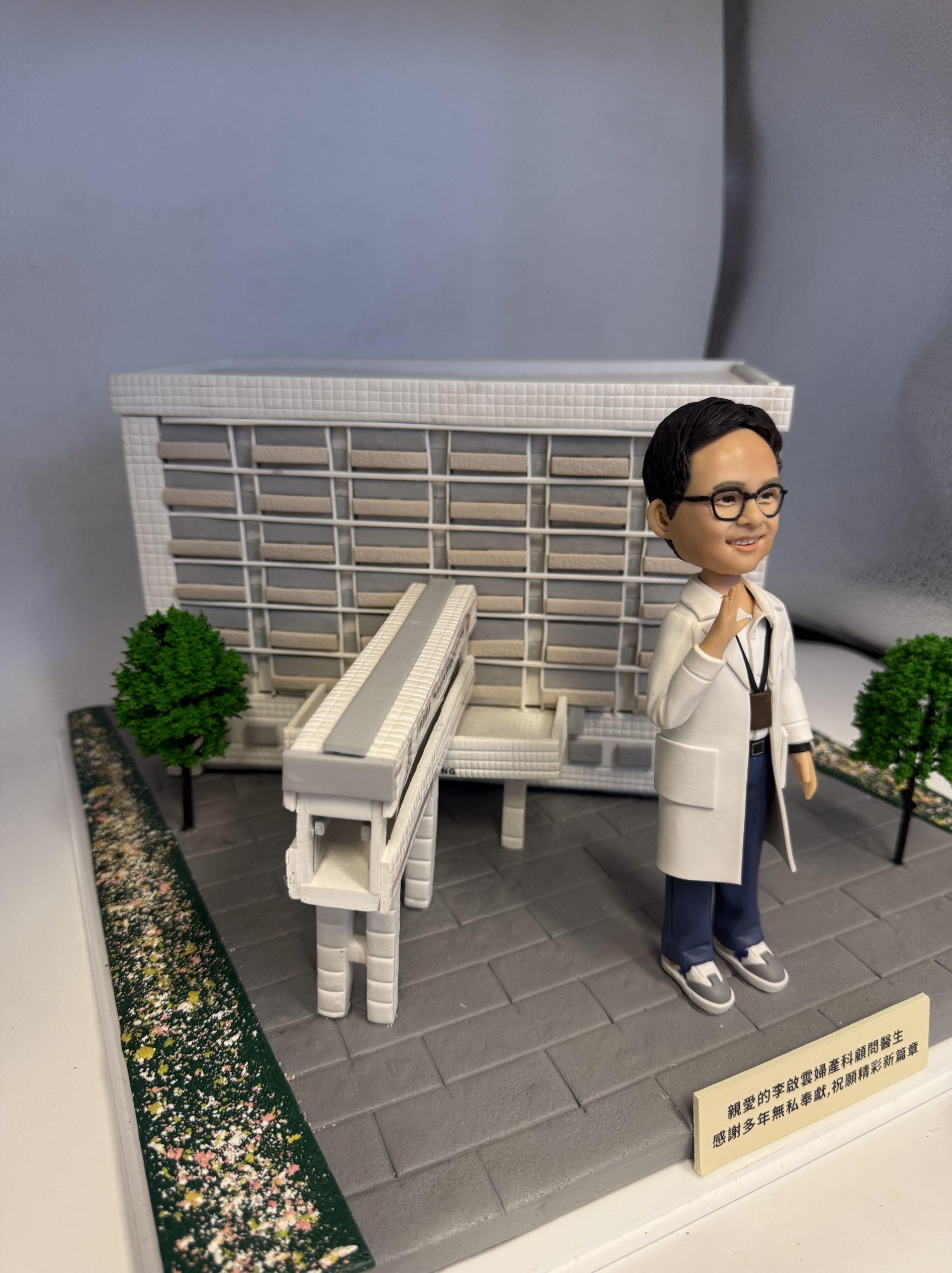 多張照片展示一組醫療主題的人像公仔場景:穿白袍、戴眼鏡的公仔站在灰色地磚平台上,頸掛證件、右手舉起示意。背後是白色方格磚紋的大型建築模型,立面有橫向百葉結構,前方連接一段高架走道與入口雨棚;平台兩側種有綠色圓頂小樹與鋪滿花瓣的綠化帶。前方小銘牌以中文寫上致謝字樣。部分照片顯示整套作品收納於透明展示盒,綁有綠色緞帶。