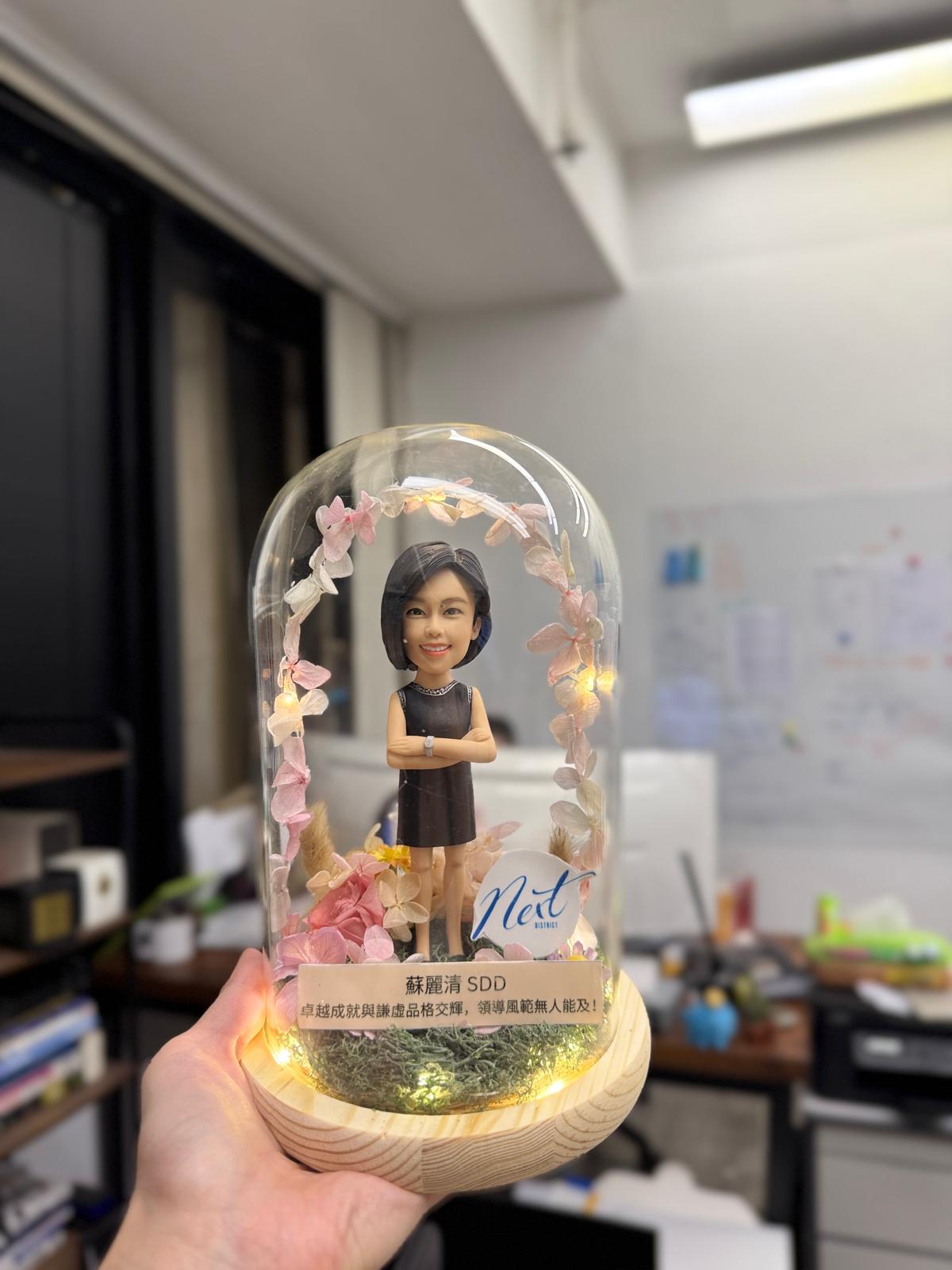 浪漫典雅的客製公仔作品:人物著黑色無袖洋裝、項鍊與腕錶,站姿自信。外層為玻璃穹頂,內圈以粉白乾燥花與暖色燈串點綴,底部木質燈座鋪苔蘚草地並附客製銘牌與標誌,適合辦公室或居家擺設。可客製服裝款式、花色主題、燈光模式、姓名職銜與祝賀語,特別適合升遷賀禮、榮耀表揚、生日或周年紀念。