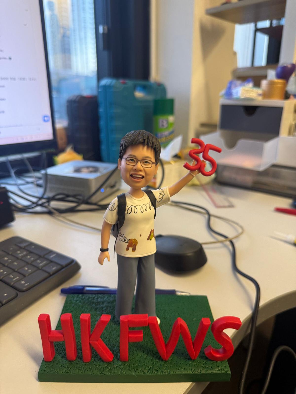 戴眼鏡的人像公仔背著背包、穿白色塗鴉T與灰色長褲,右手高舉紅色「35」,站在綠色草地底座,前方立體紅字「HKFWS」