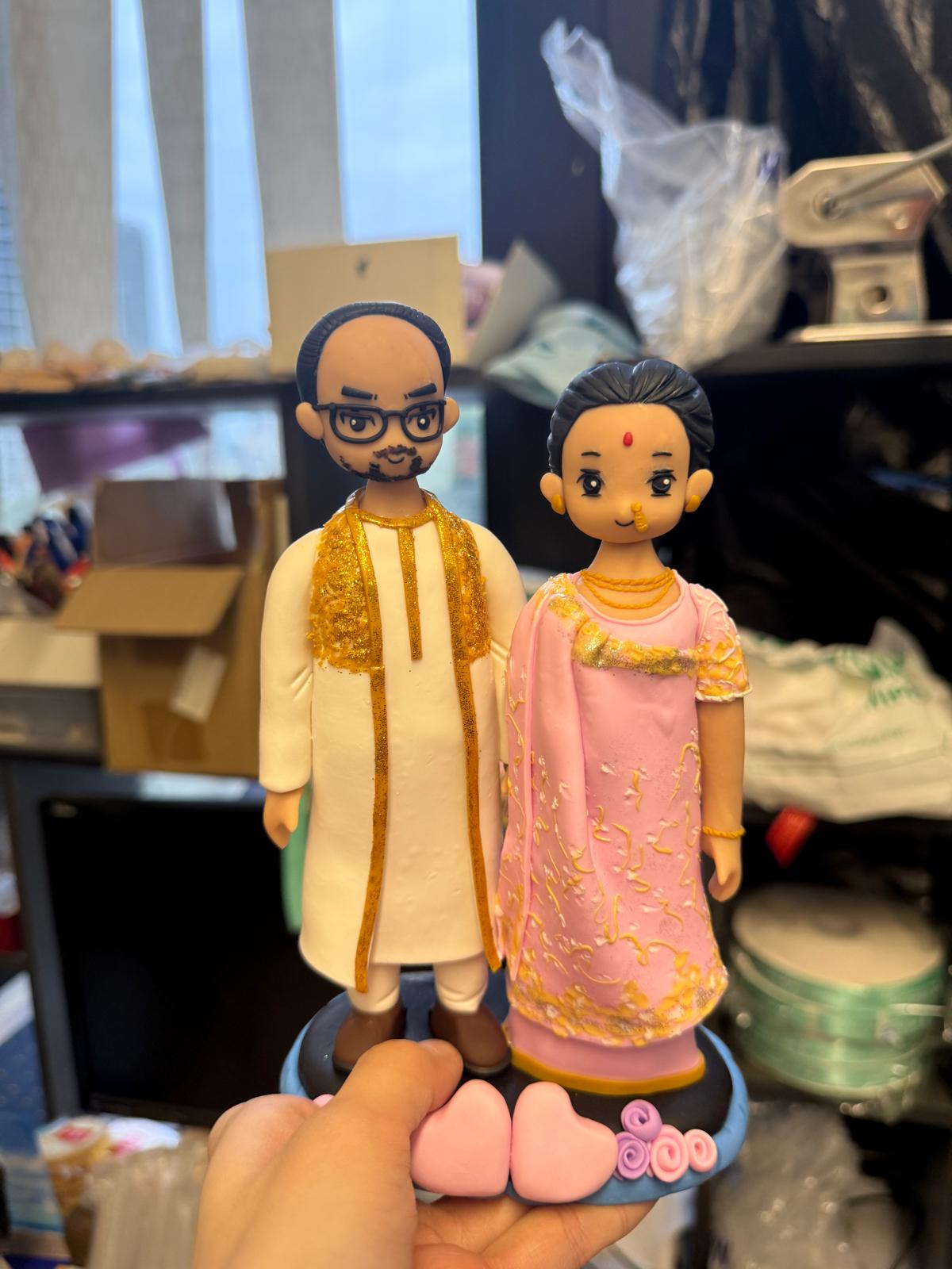 客製雙人主題公仔,以印度傳統禮服為靈感:男生白袍襯金色披飾,女生粉金紗麗與首飾點綴,造型隆重浪漫。底座前置愛心與玫瑰手作裝飾,適合作為婚禮禮物、周年紀念或異國文化主題收藏。可客製服飾配色、首飾樣式、髮型與底座銘牌。