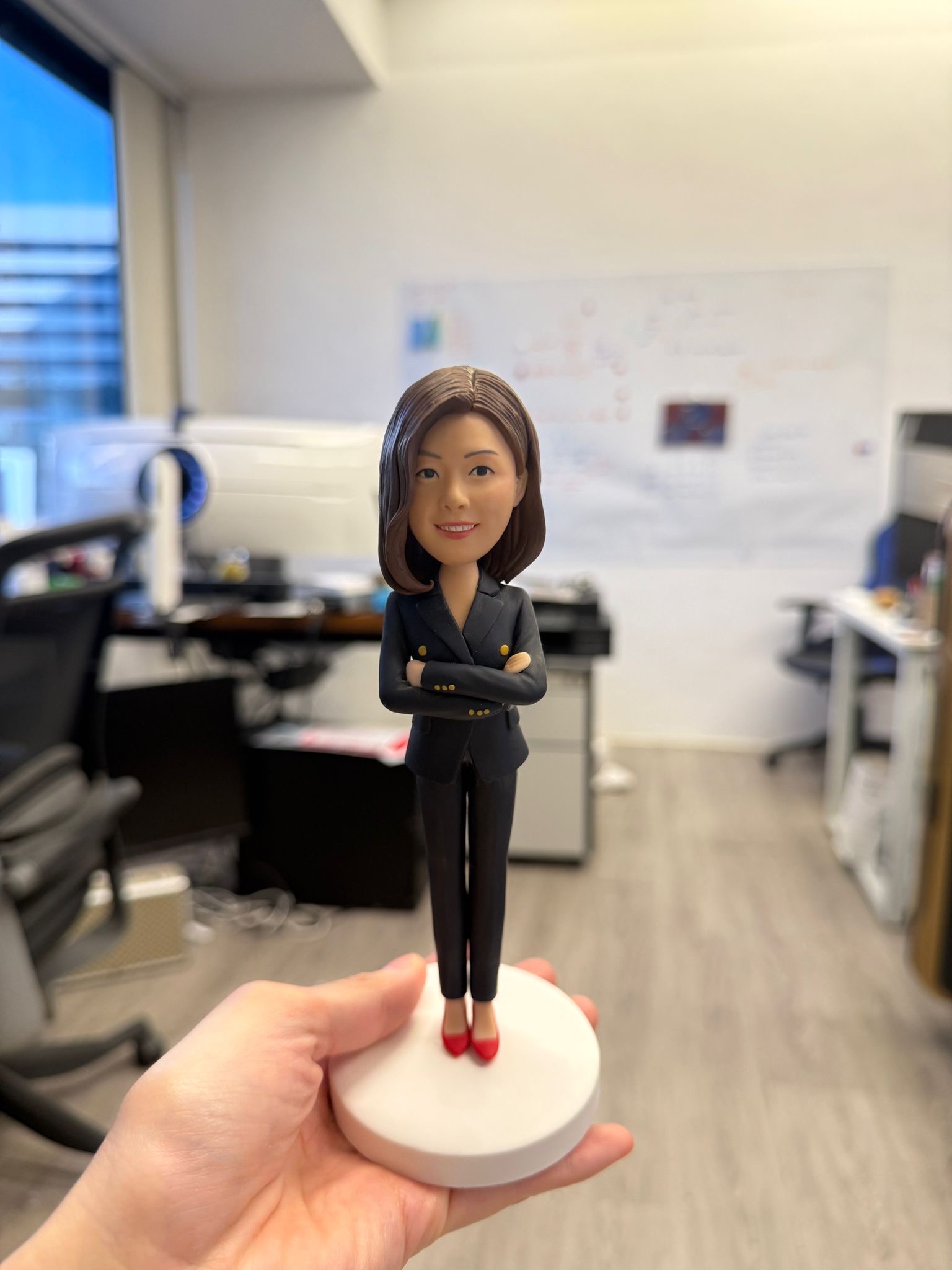 辦公室主題的人像公仔:整體造型挺拔,站姿自信,雙手交疊於胸前,散發出專業與幹練的氣質。她身穿剪裁合身的