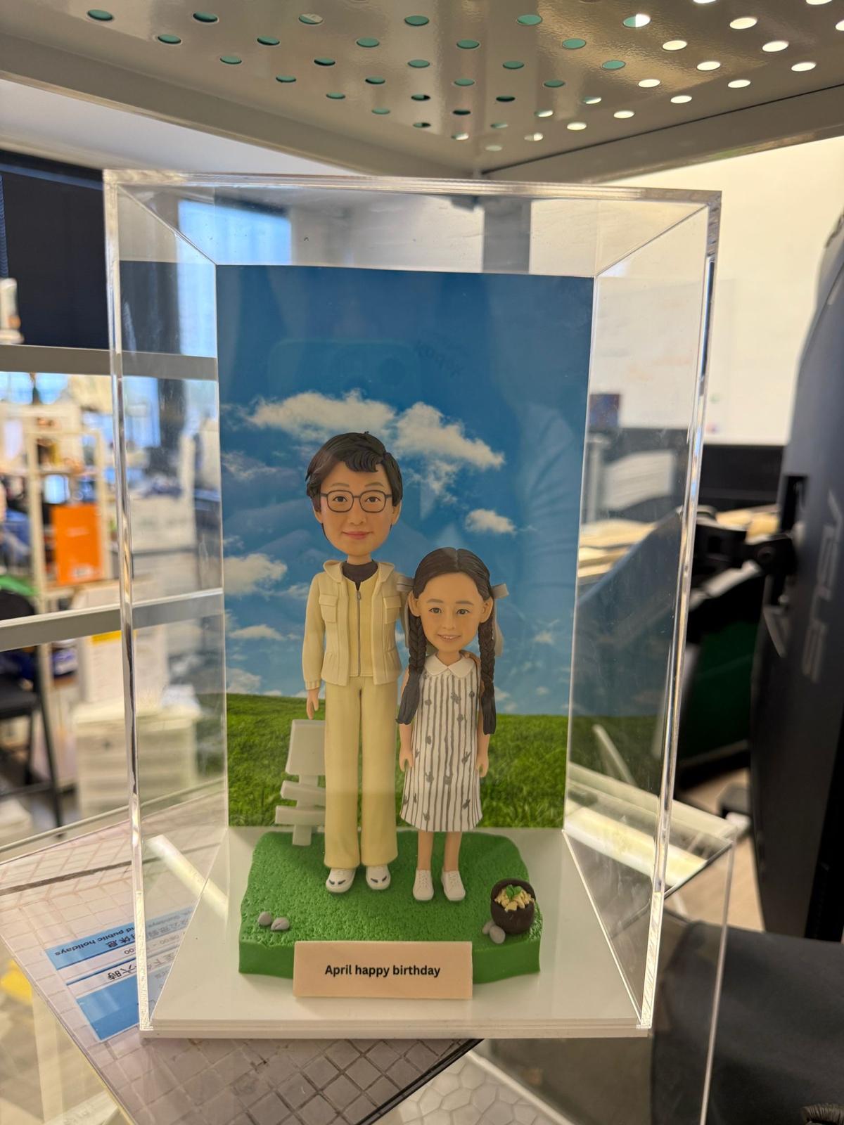 親子雙人公仔站在綠色草地底座上,後方是藍天白雲背板與白色小椅,前方銘牌刻字「April happy birthday」,旁邊擺有小盆栽與石頭點綴