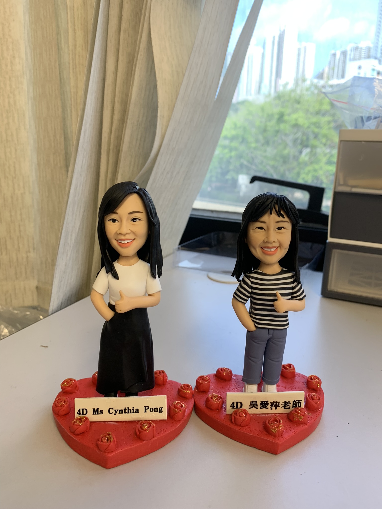 以溫馨可愛風格呈現教師日常形象,兩款造型分別展現白T長裙與條紋上衣休閒造型,自然笑容與親切姿態象徵教學中的關懷與活力。底座設計為紅色愛心搭配立體玫瑰花環,寓意學生滿滿的感謝與祝福。