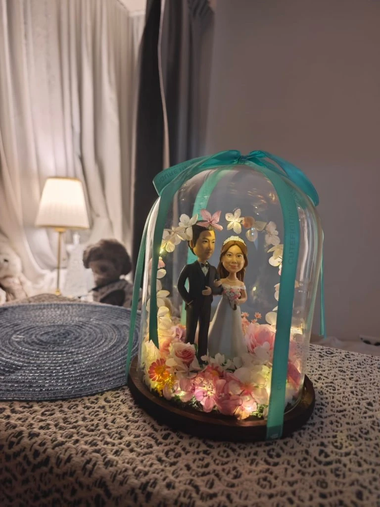 - 從「物件」到「場景」的質變: 品牌交付的不再是兩個獨立的公仔,而是一個完整的、包含環境、氛圍和故事的「立體場景」。永生花、苔蘚地台、以及點點燈串,共同構建了婚禮的浪漫氛圍。CUTEFIGUREHK 在這裡的角色,從一個「人像雕塑師」擴展為一個「場景導演」和「氛圍設計師」。他們不僅雕塑「人」,更在雕塑「時空」。